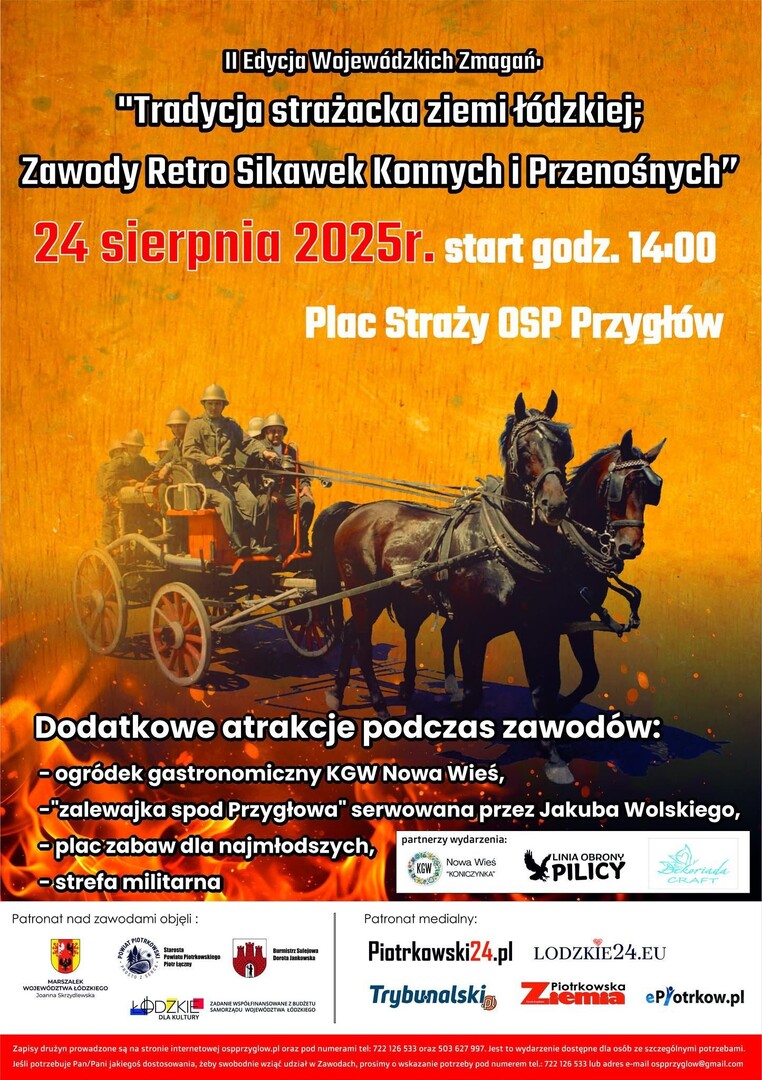 Jednostka Ochotniczej Straży Pożarnej kontynuując swoje tradycje organizowania zawodów „retro” sikawek konnych i przenośnych przeprowadzi drugą edycję tego typu zawodów na szczeblu województwa łódzkiego, które odbędą się już w najbliższą niedzielę 24 sierpnia na boisku OSP Przygłów (ul. Sulejowska 33).