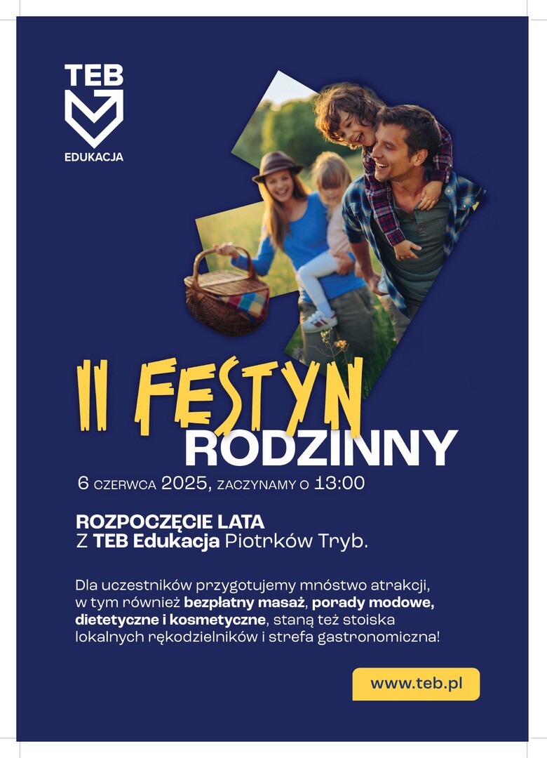 TEB Edukacja w Piotrkowie Trybunalskim serdecznie zaprasza wszystkich mieszkańców na Festyn Rodzinny, który odbędzie się 6 czerwca, przy szkole (parking), przy ul. Polnej 13/13A, w godzinach 13:00 – 19:00.