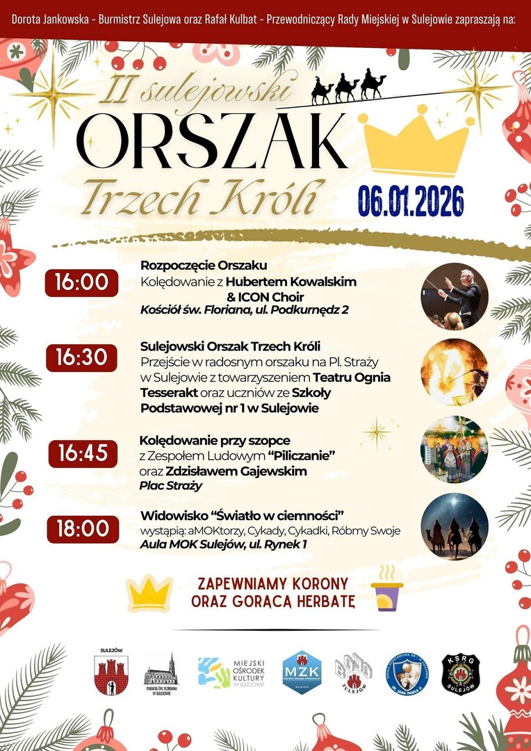Burmistrz Sulejowa Dorota Jankowska oraz Przewodniczący Rady Miejskiej Rafał Kulbat zapraszają mieszkańców oraz gości na II Sulejowski Orszak Trzech Króli – wydarzenie łączące tradycję, wspólne kolędowanie i widowiskowe atrakcje artystyczne.