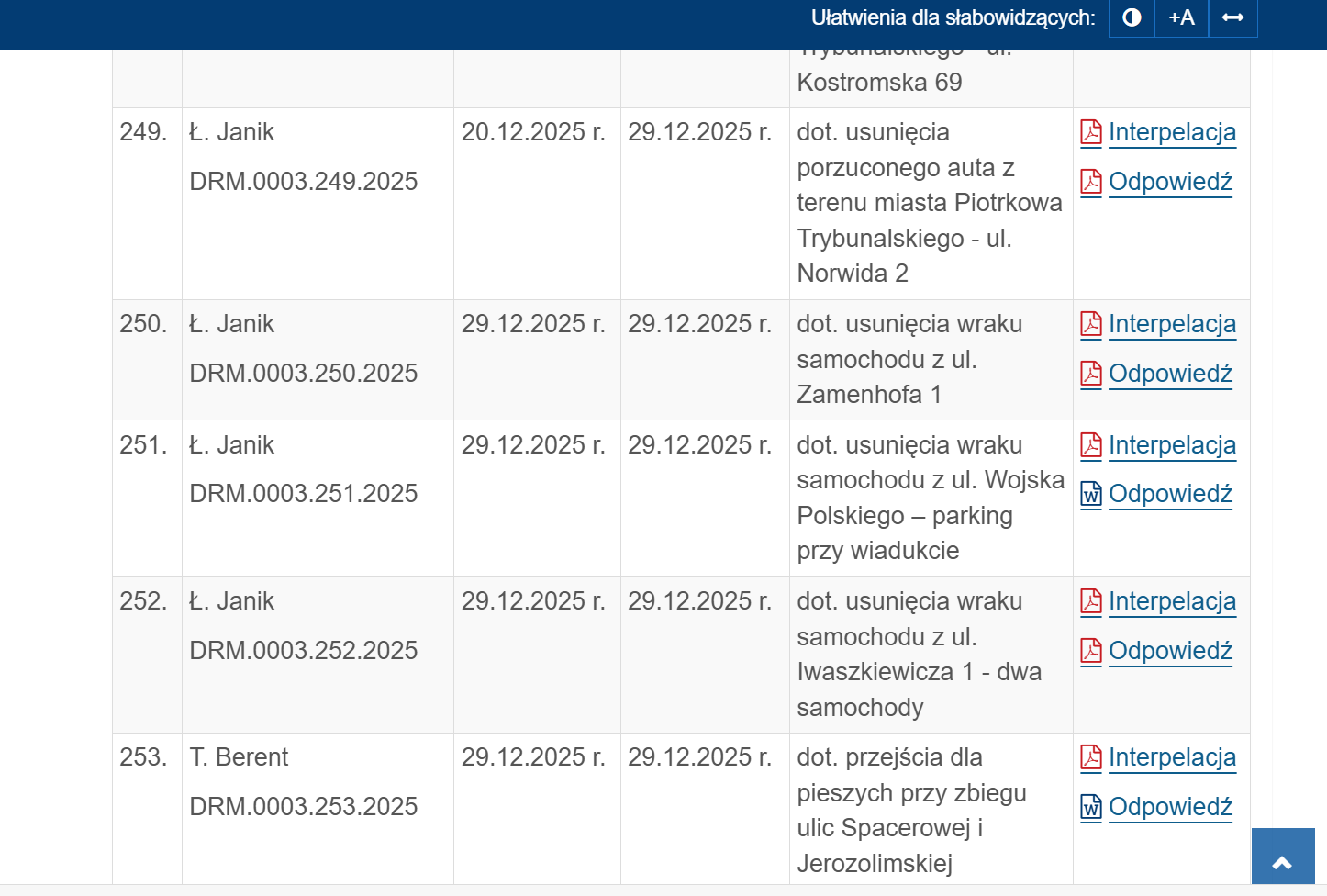 255 interpelacji i zapytań złożyli radni Rady Miasta w Piotrkowie w 2025 roku. Spośród 23 rajców aż 8 nie miało żadnych uwag czy spostrzeżeń. Liderem pozostał Jan Dziemdziora (Piotrkowskie Porozumienie Samorządowe), a tuż za nim Agnieszka Chojnacka. To oni mieli najwięcej interpelacji i zapytań.