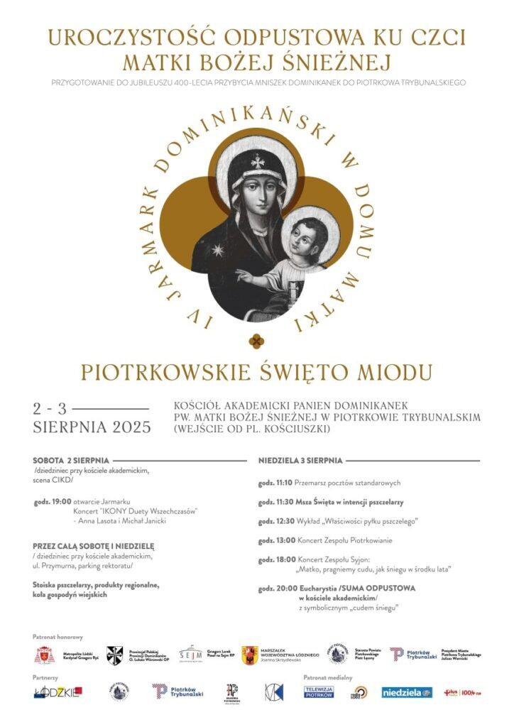 Już w pierwszy weekend sierpnia Piotrków Trybunalski stanie się miejscem pełnym tradycji, muzyki, zapachów i smaków! 2–3 sierpnia 2025 roku zapraszamy na IV Jarmark Dominikański oraz Uroczystość Odpustową ku czci Matki Bożej Śnieżnej, które w tym roku odbywają się pod hasłem Piotrkowskie Święto Miodu.