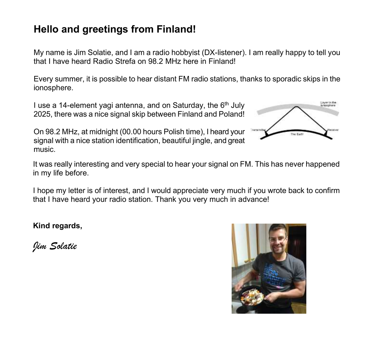 Do redakcji Strefy FM w Piotrkowie Trybunalskim dotarł wyjątkowy list od Jima Solatie – fińskiego nasłuchowca i miłośnika radia, który odebrał sygnał lokalnej stacji... aż w Espoo, w południowej Finlandii! To niecodzienna wiadomość, która pokazuje, że radio może łączyć ludzi na setki, a nawet tysiące kilometrów.