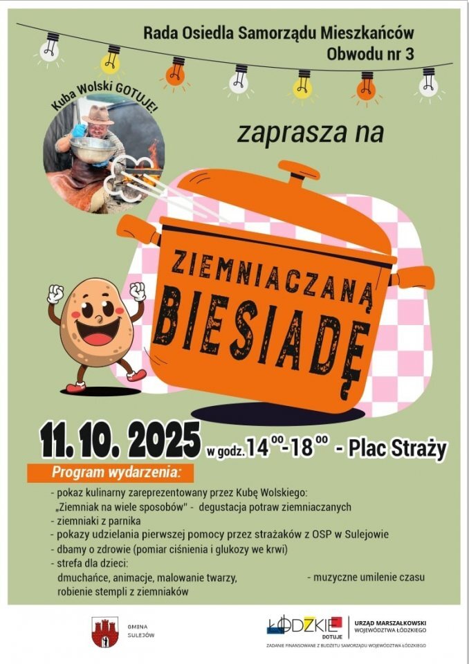 W sobotę, 11 października 2025 roku, na Placu Straży w Sulejowie (obwód nr 3), odbędzie się piknik pod  nazwą „Ziemniaczana Biesiada”. Organizatorzy zapraszają mieszkańców w godzinach od 14:00 do 18:00 na pełne smaku, muzyki i dobrej zabawy spotkanie osiedlowe. W programie przewidziano m.in. animacje dla dzieci, konkursy z nagrodami, degustacje lokalnych potraw – oczywiście z ziemniakiem w roli głównej – oraz występy artystyczne. Nie zabraknie również stoisk tematycznych i miejsca do wspólnej biesiady.