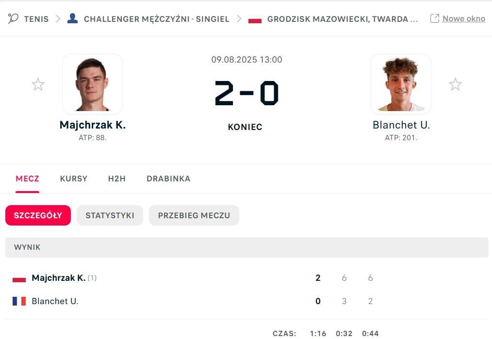 Pierwszy set trwał zaledwie 32 minuty, a kluczowe okazało się pojedyncze przełamanie podania Francuza w czwartym gemie, przy pierwszym i jedynym break poincie w tej części gry. To pozwoliło Kamilowi zbudować prowadzenie 4:1, a następnie 5:2. Wykorzystał pierwszego setbola przy 5:3 i 40-30. Druga partia była dłuższa, bo 44-minutowa, ale i w niej przewagę na korcie miał cały czas Majchrzak, grający pewniej, ofensywniej i precyzyjniej od niżej notowanego rywala. Na otwarcie wykorzystał drugiego break pointa, a po swoim serwisie utrzymanym do zera odskoczył na 2:0. Kolejne dwa break pointy miał w piątym gemie, a drugiego zamienił na prowadzenie 4:1. Co prawda zaraz po tym sam znalazł się w opałach i przy drugiej szansie dla rywala stracił podanie, to jednak nie wybiło go z rytmu. Wygrał dwa ostatnie gemy i przy pierwszym meczbolu zapewnił sobie awans do finału – relacjonuje tenismagazyn.pl