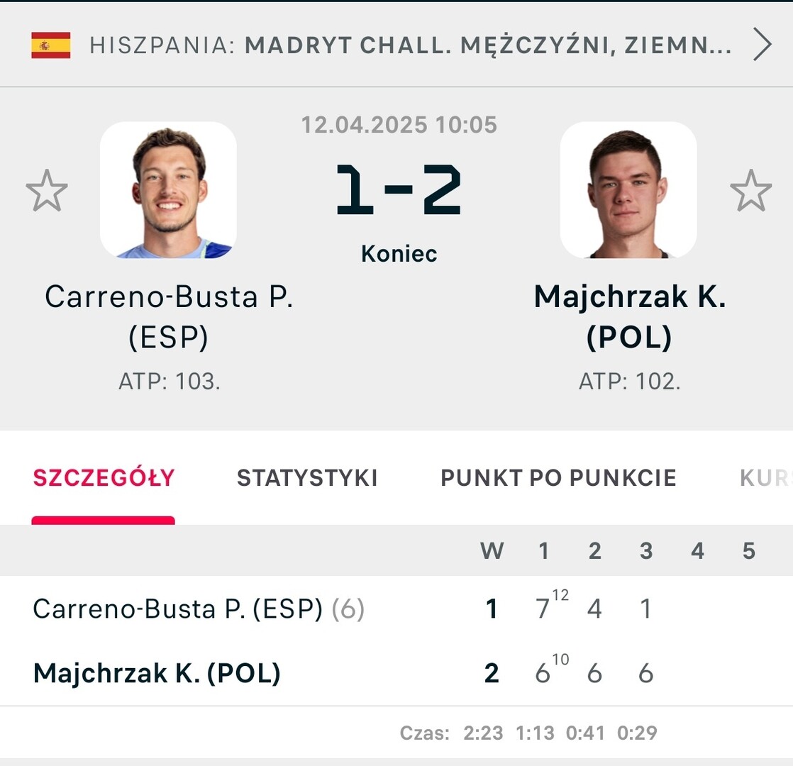 Pierwszy set był bardzo wyrównany. Doświadczony Hiszpan ostatecznie wygrał w tiebreaku 12-10. Kamil Majchrzak z kolei wygrał drugiego seta do 4. O końcowym wyniku miał zdecydować trzeci set. Piotrkowianin wygrał pierwsze cztery gemy dość gładko. Dopiero w piątym Hiszpan okazał się lepszy, choć Kamil miał kilka szans na przełamanie. W szóstym gemie polski tenisista wygrał bez problemów i zrobiło się 5-1. Ostatni gem także należał do piotrkowianina.