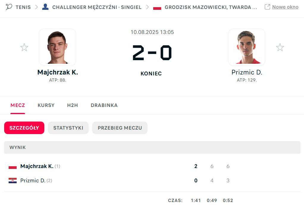 Piotrkowianin okazał się najlepszy w challengerze na twardej nawierzchni w Grodzisku Mazowieckim. W finale pokonał Chorwata Danila Prizmica w dwóch setach 6-4, 6-3. Po tych zawodach prawdopodobnie awansuje na 75. miejsce w rankingu ATP wyrównując swój najlepszy wynik. Teraz Kamila czeka rywalizacja w wielkoszlemowym US Open. W 2019 roku dotarł tam do III rundy.