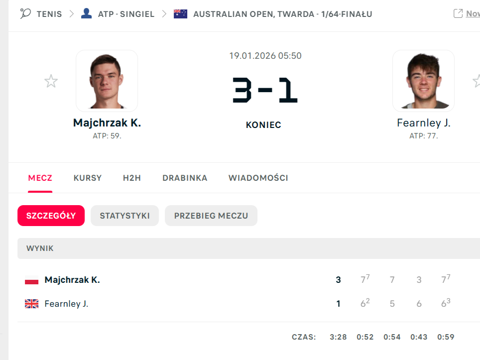 Majchrzak zajmuje najwyższe w karierze 58. miejsce w światowym rankingu, Fearnley jest 77. Do tej pory spotkali się raz - w 2024 w kwalifikacjach halowej imprezy w Sztokholmie górą był zawodnik z Worcester, który w czerwcu zeszłego roku na tydzień zagościł w TOP 50 listy ATP – przypomniał Eurosport.