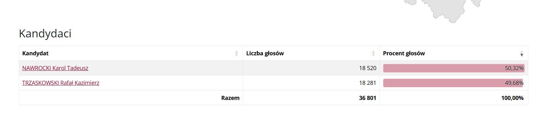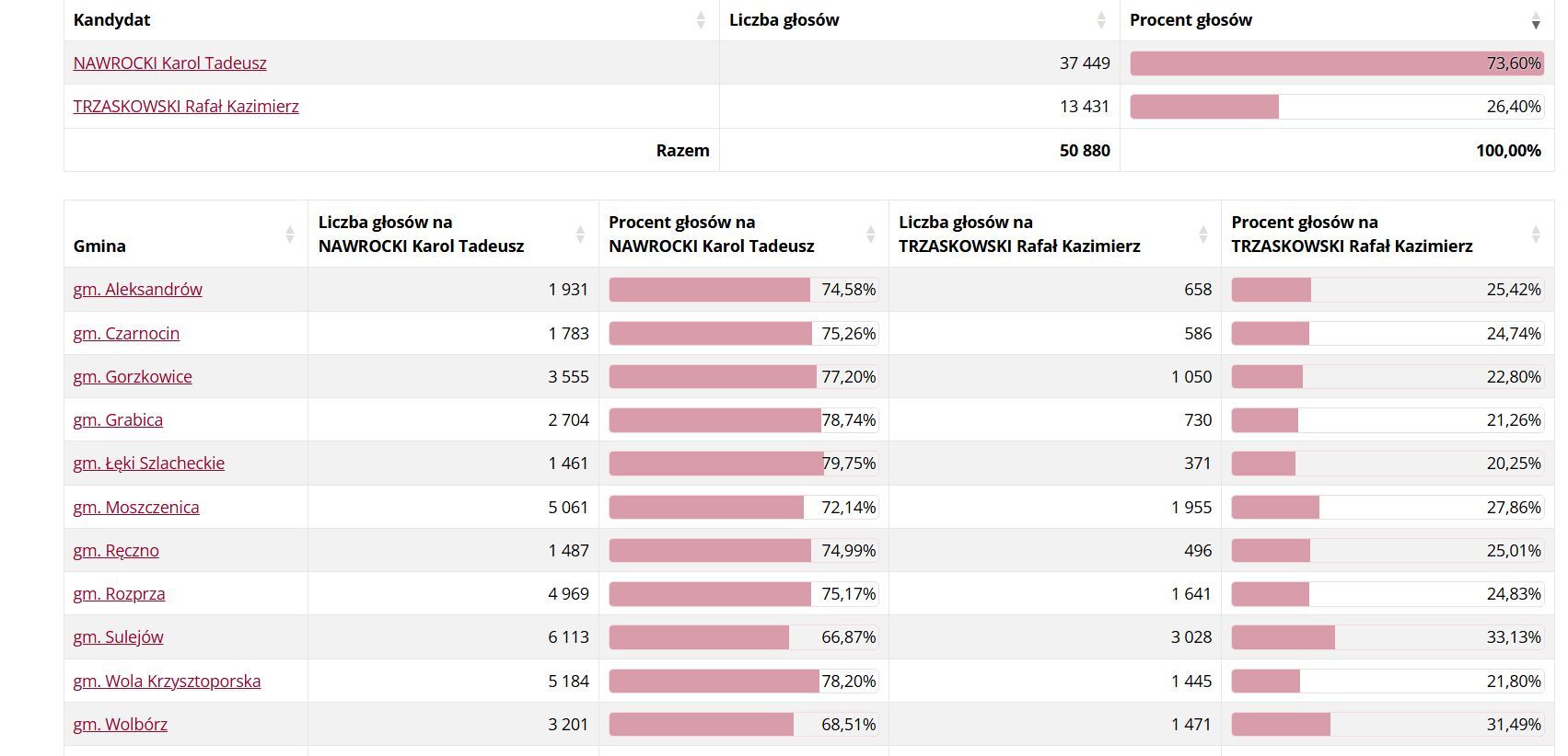 W Piotrkowie minimalnie wygrał Karol Nawrocki uzyskując 50,32% głosów, Rafał Trzaskowski zdobył 49,68%. Podobnie było w powiecie piotrkowskim, ale tu przewaga Nawrockiego była już zdecydowana. Uzyskał 73,60%, a Trzaskowski tylko 26,40%.
