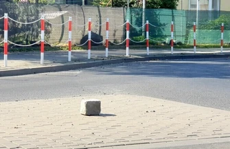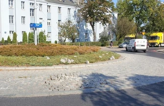 Na zielonej części ronda leży już kilkanaście dużych elementów bruku, które dla bezpieczeństwa przerzucili tam kierowcy. To kostki brukowe ważące kilka kilogramów, o boku liczącym około 20 cm.