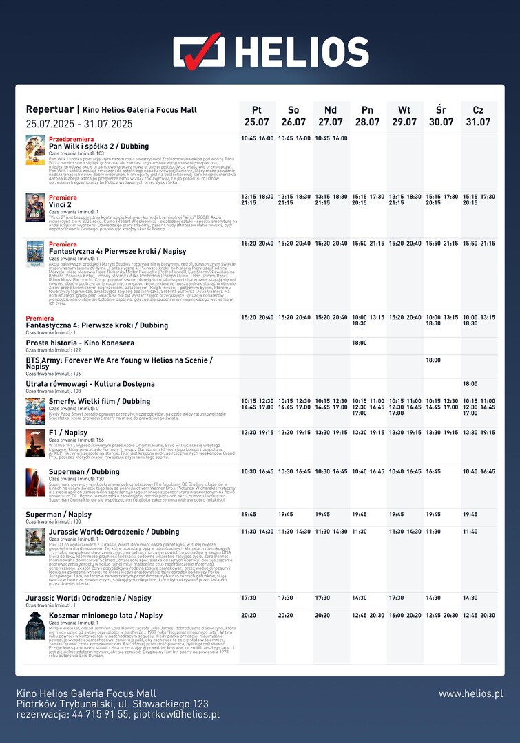Przygotujcie się na przedpremierowe szaleństwo z „Panem Wilkiem i spółką 2”! Ukochani bohaterowie wracają, tym razem wplątani w pełną zwrotów akcji, międzynarodową aferę. A to dopiero początek kinowych atrakcji! W repertuarze również: długo wyczekiwane „Vinci 2”, superbohaterska jazda z „Fantastyczną Czwórką”, wzruszająca „Prosta historia”, poruszający dokument „BTS Army: Forever We Are Young” i mocny polski dramat „Utrata równowagi”. To wszystko w kinie Helios - Piotrków Trybunalski.