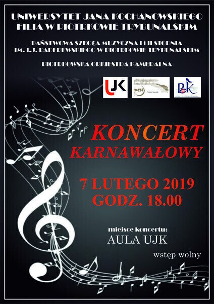 W czwartek, 7 lutego, piotrkowska Filia Uniwersytetu Jana Kochanowskiego oraz Piotrkowska Orkiestra Kameralna zapraszają mieszkańców miasta i okolic na Trzeci Koncert Karnawałowy. Początek wydarzenia zaplanowano na godzinę 18.00 – wstęp wolny. W ramach koncertu, który odbędzie się w auli uczelni, zagrają: kwartet saksofonowy, kwartet smyczkowy, trio fortepianowe oraz Piotrkowska Orkiestra Kameralna i orkiestra smyczkowa Państwowej Szkoły Muzycznej II stopnia. Tego wieczoru wystąpi również Magdalena Hudzieczek-Cieślar (sopran). Podczas koncertu będzie można usłyszeć walce, polki i tanga takich kompozytorów, jak Piotr Czajkowski, Dmitrij Szostakowicz, Johann Strauss, muzykę filmową Henry’ego Manciniego i Johna Wiliamsa, przeboje zespołu Queen oraz Brathanki.