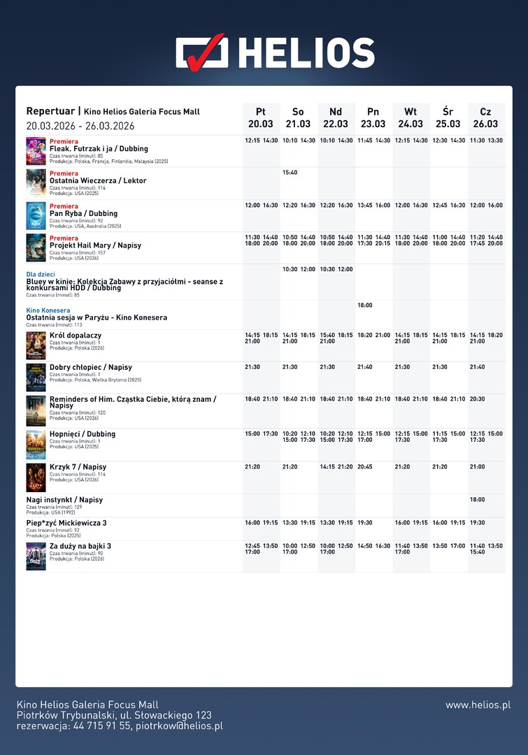 Nowe premiery, familijne animacje i propozycje dla wymagających widzów – repertuar kina Helios w Piotrkowie Trybunalskim zapowiada się wyjątkowo różnorodnie. Na ekranie pojawią się zarówno pełne przygód historie dla najmłodszych, jak i widowiskowe science fiction czy psychologiczne kino z gwiazdorską obsadą. Widzowie w każdym wieku znajdą coś dla siebie – od lekkiej rozrywki po emocjonujące i skłaniające do refleksji opowieści.