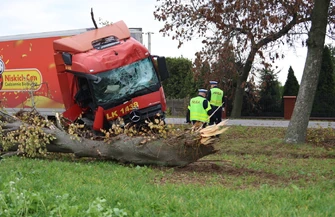 Kierowca ciężarówki, chcąc uniknąć zderzenia, zjechał do przydrożnego rowu, gdzie uderzył w drzewo. Siła uderzenia była tak duża, że drzewo zostało wyrwane z korzeniami i przewrócone. Mężczyzna może mówić o ogromnym szczęściu – mimo dramatycznego przebiegu wypadku nie odniósł poważnych obrażeń.