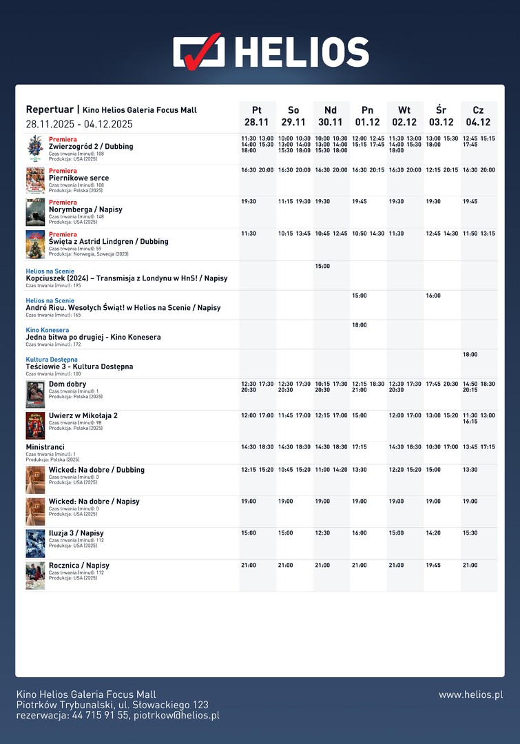 W kinie Helios Piotrków Trybunalski - grudzień rozbrzmiewa przygodą, wzruszeniem i świąteczną magią. Na ekranach pojawiają się gorące premiery – od powrotu do kultowego Zwierzogrodu, przez pachnącą piernikami komedię romantyczną, po wciągający dramat historyczny i baśniową podróż do świata Astrid Lindgren. Do tego wyjątkowe wydarzenia specjalne, filmowe koncerty oraz kino dla wymagających. Sprawdź, co czeka na widzów w tym tygodniu!