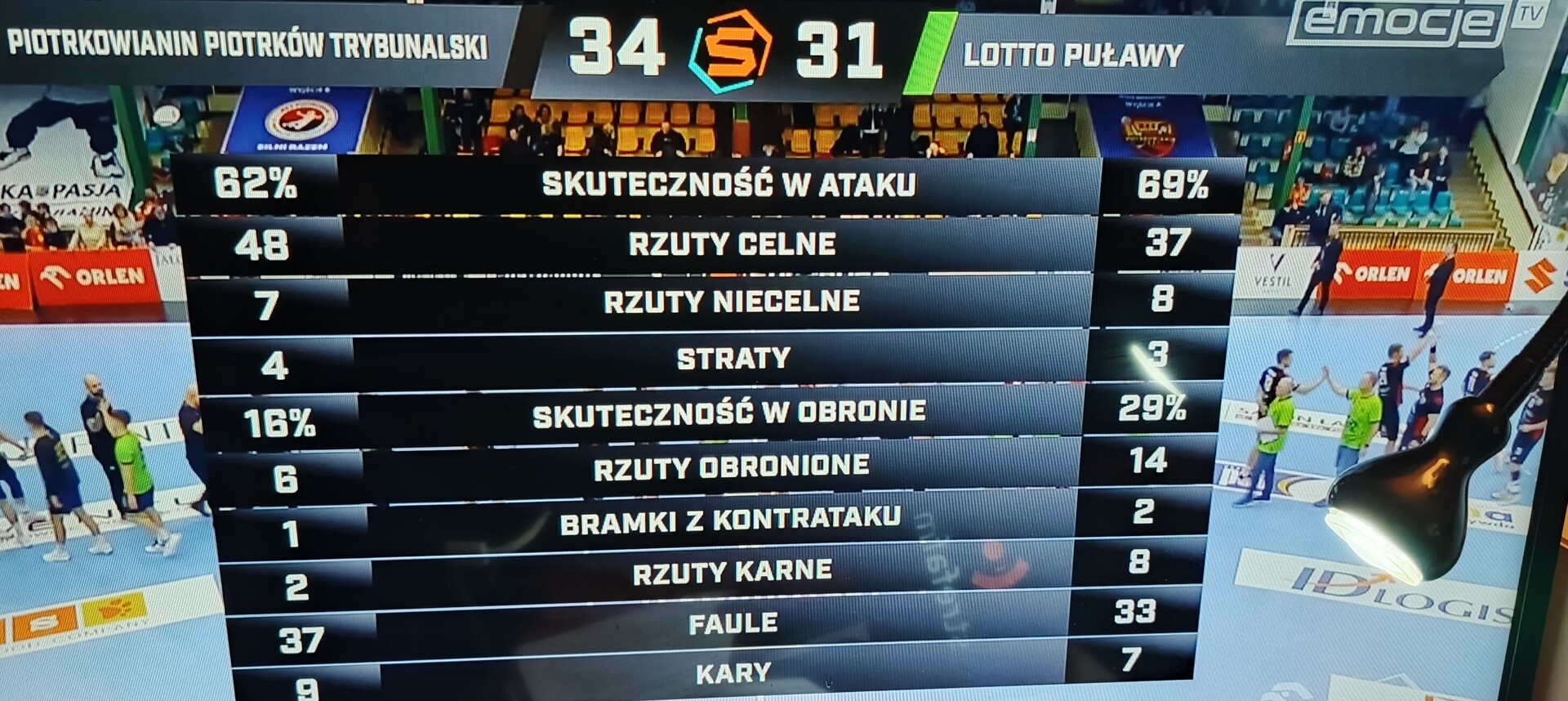 W 34 minucie Artur Kot obronił rzut karny wykonywany przez Komarzewskiego i to nasz zawodnik okazał się lepszy. I w 37 minucie dokonał tego ponownie! Tym razem nie trafił Łyżwa. Kontuzji doznał Artemienko, którego dwaj szczypiorniści Piotrkowianina znieśli z boiska. Niestety podopieczni Vita Teleya musieli grać w dużym osłabieniu, bowiem aż dwóch naszych zostało ukaranych (Szopa i Dróżdź). Na szczęście goście nie wykorzystali sytuacji.