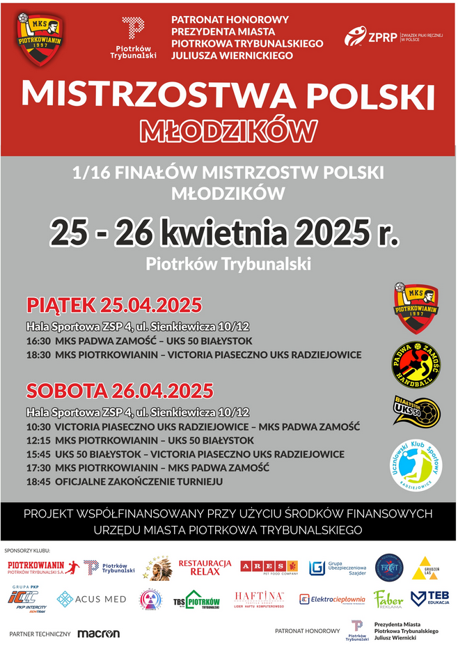 Piotrków Trybunalski będzie gospodarzem turnieju 1/16 finału Mistrzostw Polski Młodzików, który rozegrany zostanie w dniach 25-26 kwietnia w hali sportowej Zespołu Szkół Ponadpodstawowych numer 4 przy ulicy Sienkiewicza 10/12.