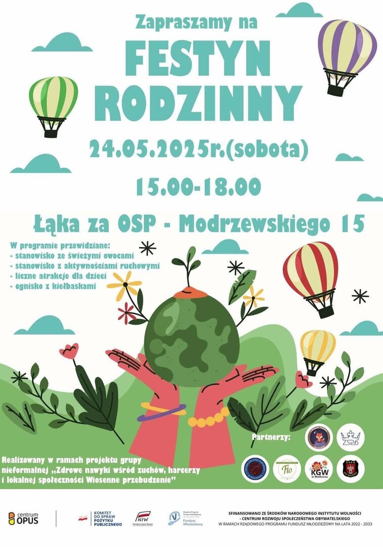 Festyn odbędzie się 24 maja 2025 r. (sobota) w godzinach 15:00–18:00 na łące za OSP przy ul. Modrzewskiego 15