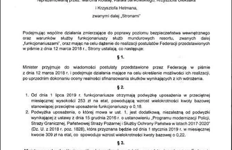 Od 1 stycznia 2019 r. w ramach podwyżek z Programu Modernizacji Służb Mundurowych policjanci, strażacy, strażnicy graniczni i funkcjonariusze SOP otrzymają średnio o 309 zł podwyżki na etat, a pracownicy cywilni o 300 zł. Dodatkowo od 1 lipca 2019 r. funkcjonariusze mogą spodziewać się dodatkowych 253 zł, zaś cywile 250 zł.