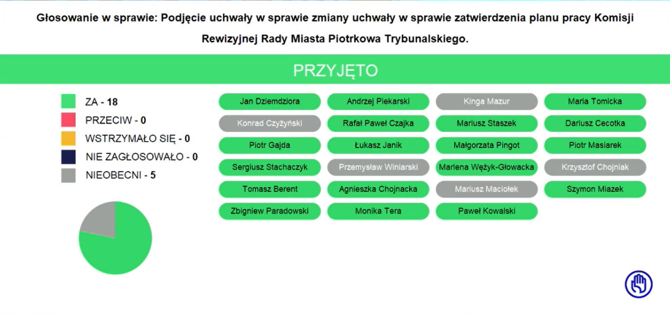 Przewodniczący Mariusz Staszek dopytuje się radnych na temat radnej Kingi Mazur "Od Trzech miesięcy nie wiemy, co się dzieje z radną". Radny Łukasz Janik "Wróciła już ze Stanów Zjednoczonych i będzie aktywna".