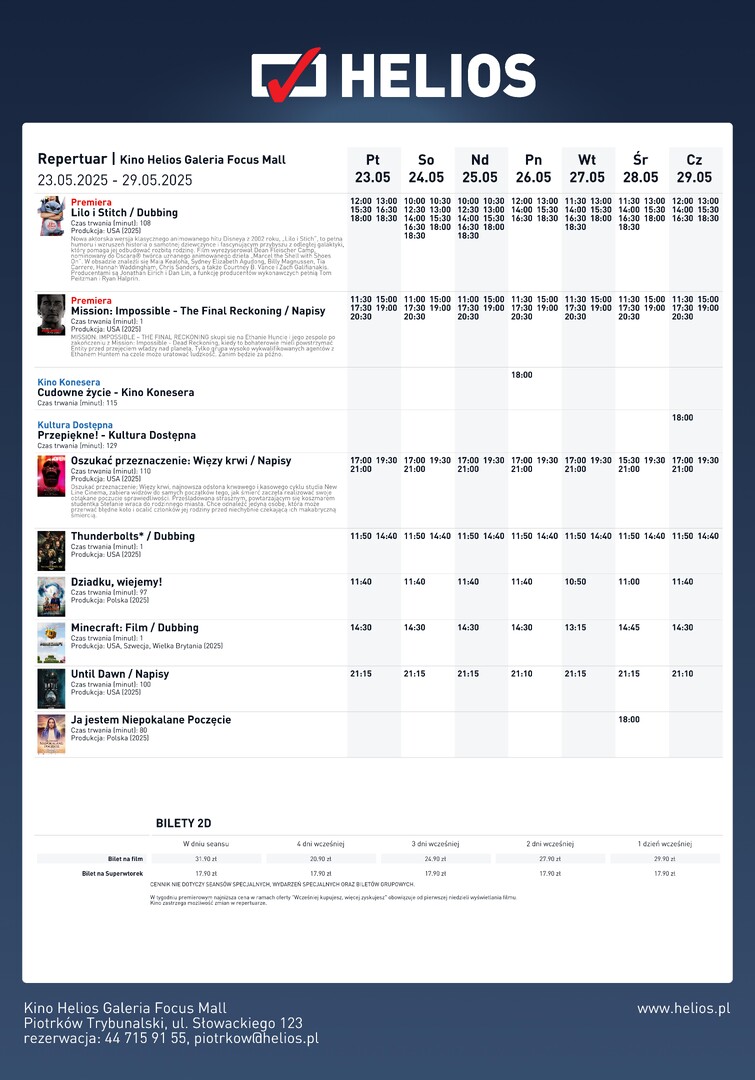 Co nowego w kinie na ekranach Helios - Piotrków Trybunalski? Premierowo "Lilo i Stitch" - Nowa aktorska wersja klasycznego animowanego hitu Disneya z 2002 roku, pełna humoru i wzruszeń historia o samotnej dziewczynce i fascynującym przybyszu z odległej galaktyki, który pomaga jej odbudować rozbitą rodzinę. "Mission: Impossible - The Final Reckoning" - Film skupi się na Ethanie Huncie i jego zespole po zakończeniu z Mission: Impossible - Dead Reckoning, kiedy to bohaterowie mieli powstrzymać Entity przed przejęciem władzy nad planetą. Tylko grupa wysoko wykwalifikowanych agentów z Ethanem Huntem na czele może uratować ludzkość. Zanim będzie za późno. I to nie wszystkie gorące hity filmowe w kinie Helios!