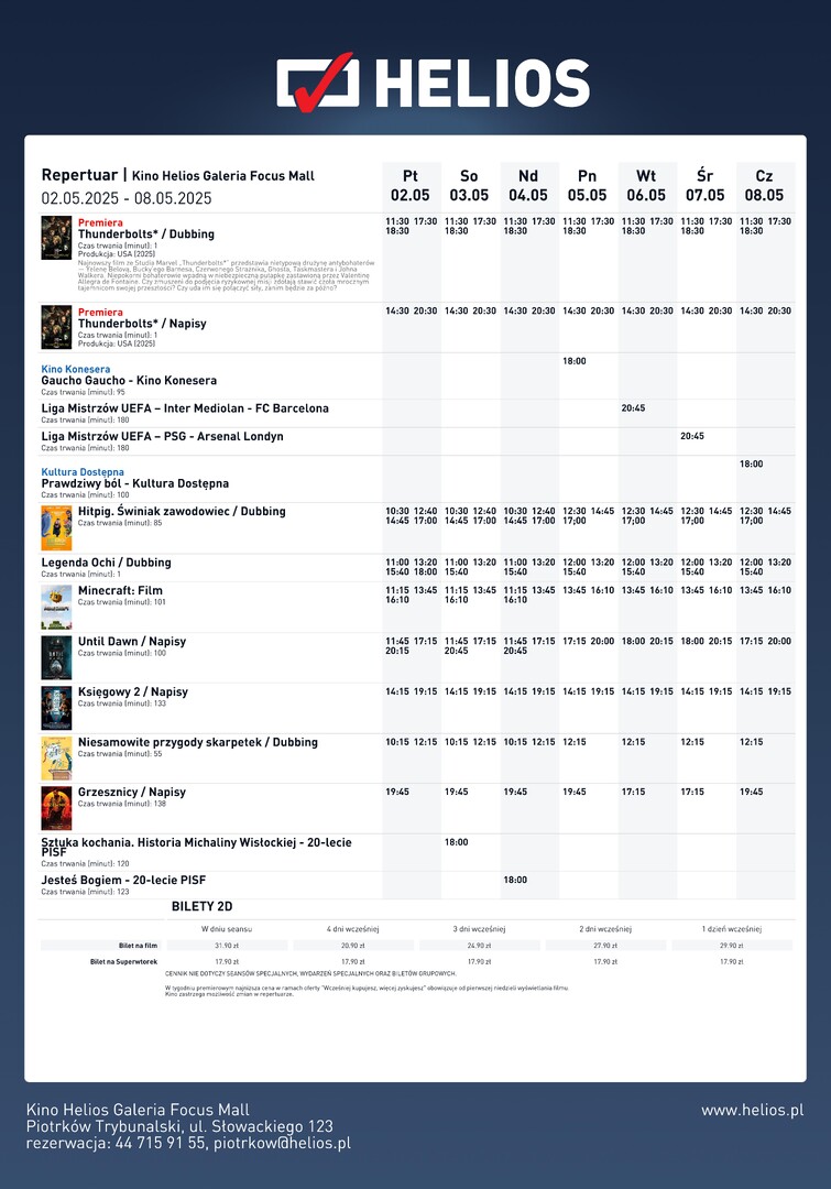 Repertuar kina Helios w Piotrkowie Trybunalski pełen filmowych emocji na początek maja! Premierowo - Thunderbolts*. Najnowszy film ze Studia Marvel „Thunderbolts*” przedstawia nietypową drużynę antybohaterów — Yelenę Belovą, Bucky’ego Barnesa, Czerwonego Strażnika, Ghosta, Taskmastera i Johna Walkera. Niepokorni bohaterowie wpadną w niebezpieczną pułapkę zastawioną przez Valentinę Allegra de Fontaine. Kino konesera Helios zaprasza na film "Gaucho Gaucho". Kultura dostępna w Helios uraczy nas filmem "Prawdziwy ból". To nie wszystkie filmowe hity w kinie Helios - Piotrków Trybunalski.
