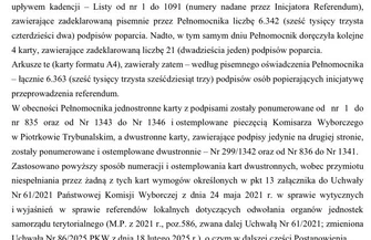 Nadmienić przy tym należy, iż liczba wad oznaczonych wyniosła 1.777 (tysiąc siedemset siedemdziesiąt siedem), co oznacza, że część pozycji z udzielonym poparciem obarczona została więcej niż jedną wadą. Wobec powyższego należy zauważyć, że nawet po weryfikacji i uwzględnieniu poprawności części podpisów poparcia złożonych na kartach niespełniających wymogów formalnych, liczba wymaganych podpisów poparcia pod przedmiotową inicjatywą referendalną pozostawała niewystarczająca – łączna liczba prawidłowo złożonych podpisów poparcia wynosić mogła maksymalnie 4.812 (cztery tysiące osiemset dwanaście), a łączna liczba nieprawidłowo złożonych podpisów poparcia wyniosła co najmniej 1.625 (jeden tysiąc sześćset dwadzieścia pięć) – a zatem wniosek nie uzyskał poparcia 10% uprawnionych do głosowania mieszkańców miasta Piotrkowa Trybunalskiego, zgodnie z art. 4 pkt 1 u.o r.l., tj. 5.351 (pięć tysięcy trzysta pięćdziesiąt jeden) prawidłowo złożonych podpisów poparcia.