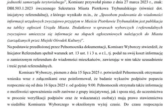 Komisarz Wyborczy postanowił odrzucić „Wniosek o przeprowadzenie referendum lokalnego” w sprawie odwołania Prezydenta Miasta Piotrkowa Trybunalskiego przed upływem kadencji i Rady Miasta Piotrkowa Trybunalskiego przed upływem kadencji, złożony do Komisarza Wyborczego w Piotrkowie Trybunalskim w dniu 14 lipca 2025 r. przez Panią Beatę Dróżdż, Pełnomocnika Inicjatora Referendum – Komitetu Referendalnego „Mieszkańcy Dla Piotrkowa Trybunalskiego” – z powodu stwierdzenia niedającego się usunąć uchybienia wniosku, polegającego na zebraniu niewystarczającej ilości prawidłowo złożonych podpisów osób popierających wniosek.