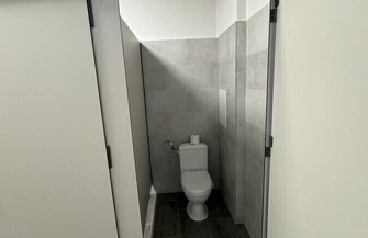 W łazience pomalowano ściany i sufit, położono płytki ścienne i podłogowe, założono wentylację, oświetlenie, węzeł sanitarny, 2 kabiny WC i sedesy, 2 umywalki z bateriami, suszarkę do rąk. Wymienione zostały też 3 skrzydła drzwiowe z futrynami.