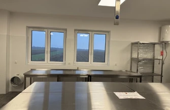 W kuchni także pomalowano ściany i sufit, położono płytki ścienne i podłogowe, założono wentylację, zlew przemysłowy z bateriami (węzeł sanitarny), drzwi z futryną (skrzydło drzwiowe), kupiono stoły ze stali nierdzewnej, regały na przybory kuchenne i zmywarkę przemysłową.