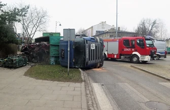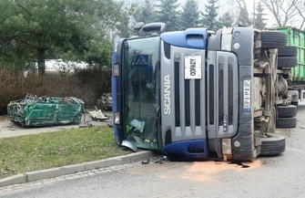 Na rondzie przy ulicy Roosevelta w Piotrkowie Trybunalskim po godzinie 10 doszło do zdarzenia, w wyniku którego ciężarówka z przyczepą wypełnioną ładunkiem przewróciła się na prawy bok. Kierowca ciężarówki jechał od Krakowskiego Przedmieścia w kierunku ulicy Roosevelta. Kierowca był trzeźwy. Na szczęście nikt nie odniósł obrażeń