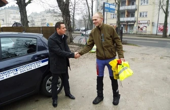 img=1 Odblaskowy Anioł w Piotrkowie otrzymał kolejną partię odblasków, które podarował Wojewódzki Ośrodek Ruchu Drogowego. Michał Franas - specjalista ds. Bezpieczeństwa Ruchu Drogowego powiedział że jest pełen podziwu dla działalności pana Macieja.