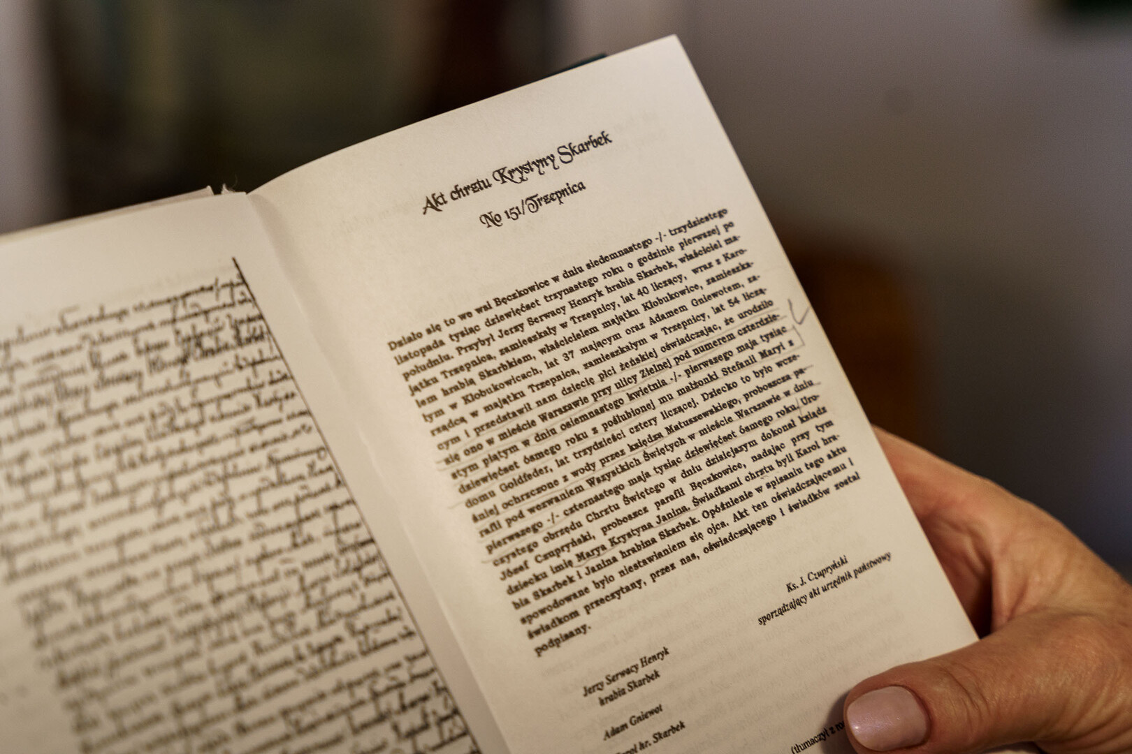Dokument, dziś znajdujący się w zasobach Muzeum w Piotrkowie, został wystawiony w 1913 roku i potwierdza, że Maria Krystyna Janina Skarbek, córka Jerzego Serwacego Skarbka i Stefanii Marii z domu Goldfeder, urodziła się wiosną 1908 roku w Warszawie przy ul. Zielnej. Dziewczynka zamieszkała w Trzepnicy, w majątku Trzepnica-Bęczkowice-Jelica, który został kupiony z posagu Stefanii, pochodzącej z rodziny zamożnych łódzkich bankierów. Mała Krysia do Trzepnicy trafiła jako 4-latka i tu spędziła dzieciństwo oraz pierwszą młodość, aż do 1926 roku. Hrabia Skarbek prowadził stadninę koni wyścigowych, więc jego córka była doskonałym jeźdźcem. Rodzina sprzedała majątek w 1926 roku i wtedy Krystyna wróciła do Warszawy. Zabytkowy dworek po wojnie stał się siedzibą miejscowej szkoły podstawowej.
