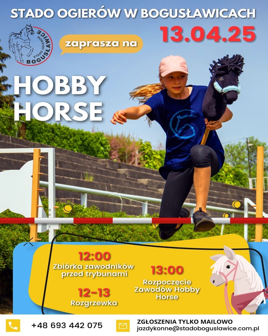 W niedziele (13.04.2025) miłośnicy hobby horse mogą zmierzyć się w zawodach w tej zyskującej popularność dyscyplinie. O godzinie 12:00 zbiórka zawodników przed trybunami. O godzinie 13:00 - rozpoczęcie zawodów. Uwaga - zgłoszenia zawodników - tylko drogą e-mail.