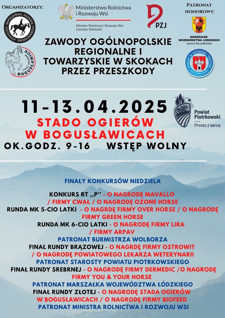 11-13 kwietnia 2025 r. w Stadzie Ogierów w Bogusławicach odbywają się Zawody Ogólnopolskie, Regionalne i Towarzyskie w Skokach przez Przeszkody. Organizatorem wydarzenia jest Stowarzyszenie Jeździeckie Napoleońska Zagroda. Wydarzeniu towarzyszy wspaniała zabawa dla całych rodzin - to m.in. zawody Hobby Horse i atrakcje dla dzieci. W czasie całych zawodów dostępny będzie duży dobrze zaopatrzony bar serwujący posiłki domowe, pizzę, zapiekanki i inne przekąski, napoje i desery lodowe. Otwarta będzie strefa Grill Bar z pysznymi potrawami z grilla oraz Food Truck - lody świderki, wata cukrowa, popcorn i gofry.