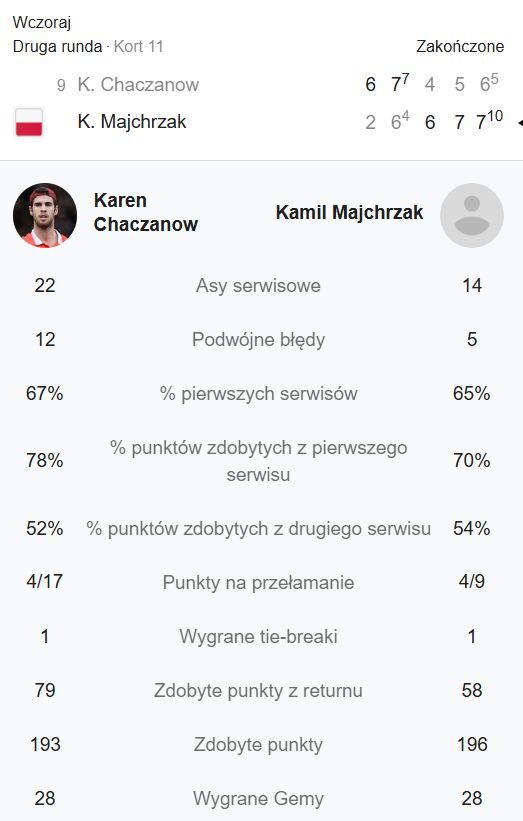Spotkanie z Rosjaninem miało szalony przebieg. Polak przegrywał już 0:2 w setach, lecz zdołał odwrócić losy rywalizacji i wygrał 3-2 w setach. W drugim secie Kamil prowadził 3-0 i 4-1, ale rywal wyrównał i w tiebreaku okazał się lepszy. W trzecim i czwartym secie to piotrkowianin był górą. A piąty set to niesamowita pogoń Majchrzaka. W decydującej partii bowiem nasz tenisista przegrywał 5-2. Chaczanow miał łącznie pięć piłek meczowych, ale na szczęście ich nie wykorzystał. Kamil doprowadził do stanu 6-6 i spotkanie rozstrzygnął w tiebreaku wygrywając 10-5.