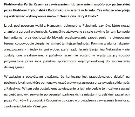 Partia Razem z Piotrkowa Trybunalskiego wystosowała petycje do rad miejskich Piotrkowa i Radomska, domagając się zawieszenia lub zerwania współpracy partnerskiej z izraelskimi miastami Ness Ziona i Kiryat Bialik. Inicjatywa wywołała kontrowersje, ponieważ dotyczy nie tylko lokalnych umów partnerskich, ale także wrażliwej kwestii polityki międzynarodowej i oskarżeń o zbrodnie wojenne w Strefie Gazy. Razem podkreśla, że celem jest sprzeciw wobec polityki państwa Izrael i wyrażenie solidarności z ludnością Palestyny, a nie atak na ludność żydowską. Miasto Piotrków Trybunalski na razie nie udzieliło komentarza, podczas gdy władze Radomska i część polityków podkreślają symboliczny charakter współpracy partnerskiej i niechęć do włączania miast w spory międzynarodowe.