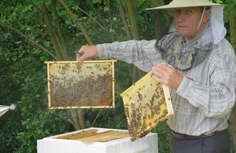 - Miód jest zasklepiony w połowie, co oznacza, że jest gotowy do wybierania. Trzeba go odsklepić z jednej i drugiej strony, a potem odwirować. Siłą odśrodkową miód spada na ścianki wirówki przez sitko. Potem rozlewanie do słoików i ... konsumpcja – tłumaczył Piotr Robaszek.