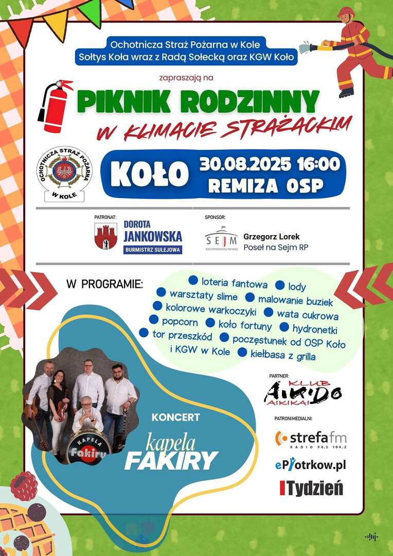Ochotnicza Straż Pożarna w Kole zaprasza na Piknik Rodzinny w klimacie strażackim.