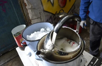 Rozkręcone palniki gazowe, a na nich garnki z gorącą wodą. W środku znajdują się stare czajniki, w których roztapia się stearyna. Obok stoi kilka kobiet, które robią ruloniki z tektury, a następnie wkładają ją do puszek. Naprzeciw kolejne osoby docinają tekturowe elementy, które za chwile będą zwijane - tak w sobotnie przedpołudnie wyglądała praca w Garażu 313 w Piotrkowie.