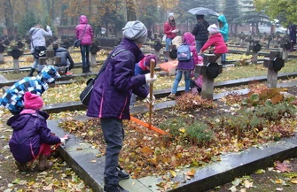 Po wysłuchaniu krótkiej informacji dotyczącej historii piotrkowskich cmentarzy, którą przedstawił przewodnik Mirosław Niewiadomski, uczestnicy odebrali szczotki i grabie przygotowane przez pracowników administracji cmentarza. Następnie przeszli w stronę kwater legionistów, gdzie pod głazem pamiątkowym z napisem CEDANT ARMAE TOGA krótką pogawędkę o piotrkowskich legionistach wygłosił przewodnik Andrzej Sabaturski. Dostosowując się do zaleceń administracji cmentarza, uczestnicy akcji przeszli na cmentarz woskowy, gdzie po odszukaniu kwater z okresu I wojny światowej przystąpiono do prac porządkowych. Uczniowie ze Szkoły Podstawowej nr 13, Gimnazjum nr 5, ZSP nr 3 oraz Specjalnego Ośrodka Szkolno-Wychowawczego przystąpili do porządkowania wybranych kwater. Po wygrabieniu liści i oczyszczeniu alejek zapalono znicze symbolizujące płomyk pamięci o poległych legionistach.