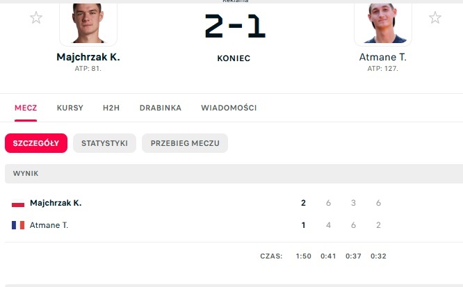 W I secie piotrkowianin pokonał Francuza 6-4, ale w drugiej odsłonie to rywal był lepszy i zwyciężył 6-3. W decydującym starciu Kamil dwukrotnie przełamał Atmana i wygrał 6-2. W 1/8 finału może trafić na wyżej notowanego Serba Laslo Djere (60. ATP) lub kwalifikanta Igacio Buse z Peru (167.ATP).