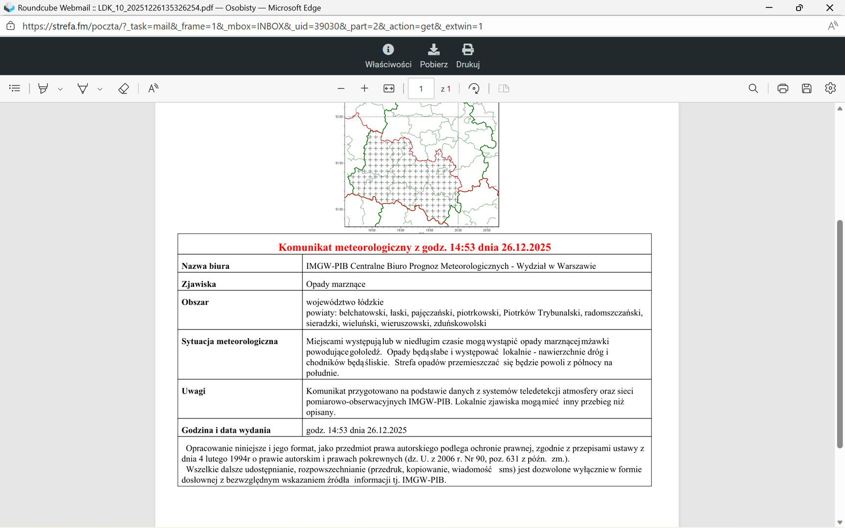 W związku z sytuacją pogodową IMGW wydał ostrzeżenia I stopnia przed opadami marznącymi dla 13 województw. Alertami objęte są mazowieckie, łódzkie, opolskie i świętokrzyskie oraz w części województw: podkarpackiego, małopolskiego, śląskiego, dolnośląskiego, podlaskiego, lubelskiego, pomorskiego, wielkopolskiego, a także warmińsko-mazurskiego. Na tych obszarach prognozowane są słabe opady marznącej mżawki powodujące gołoledź.