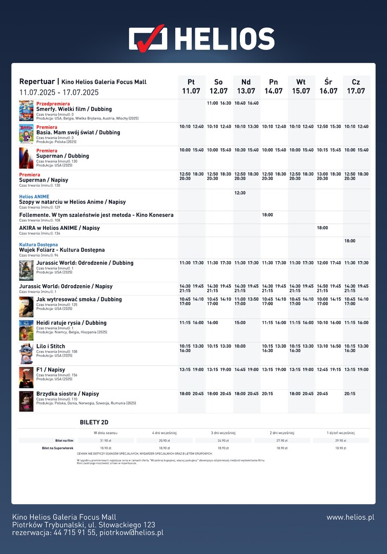 W kinie Helios - Piotrków Trybunalski same nowości! Przedpremierowo "Smerfy. Wielki film". Kiedy Papa Smerf zostaje porwany przez złych czarodziejów, na czele ekipy ratunkowej staje Smerfetka, która prowadzi Smerfy na misję do prawdziwego świata. Premierowo "Basia. Mam swój świat". Rezolutna Basia dobrze wie, czego chce. Wie też, czego nie chce. Żelki mogłaby jeść nawet na śniadanie, więc kiedy tylko nadarza się okazja, bardzo chętnie sięga po słodycze! Wizyta u dentysty jednak nie spotyka się z takim samym entuzjazmem bohaterki. "Superman". pierwszy wielkoekranowy pełnometrażowy film fabularny DC Studios, ukaże się w kinach na całym świecie tego lata za pośrednictwem Warner Bros. Pictures. I to nie wszystkie filmowe nowości w kinie Helios!