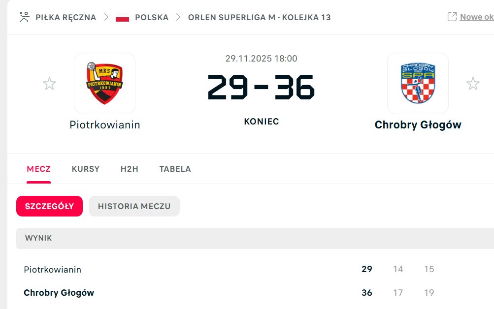 Faworytem spotkania był Chrobry Głogów, który przed meczem zajmował w tabeli Orlen Superligi piątą pozycję mając na koncie aż 18 punktów. Bukmacherzy zdecydowanie stawiali na gości. I mieli rację, bo to rywale wygrali mecz. Wynik wskazuje na sporą przewagę rywali z Głogowa bowiem wygrali 36-29. To pierwsza porażka nowego trenera.