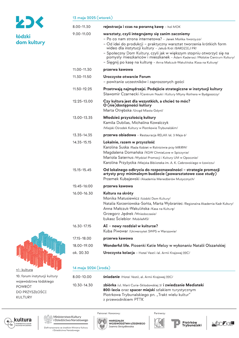 Tegoroczne Forum odbędzie się pod hasłem „Powrót do przyszłości kultury”, skłaniając uczestników do refleksji nad tym, jaką kulturę chcemy tworzyć w kolejnych latach. To nie tylko okazja do świętowania dekady wspólnych działań, ale przede wszystkim moment zatrzymania i spojrzenia w przyszłość – z otwartością, uważnością i odpowiedzialnością.