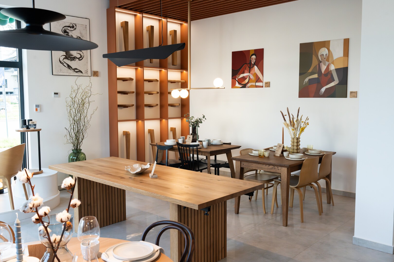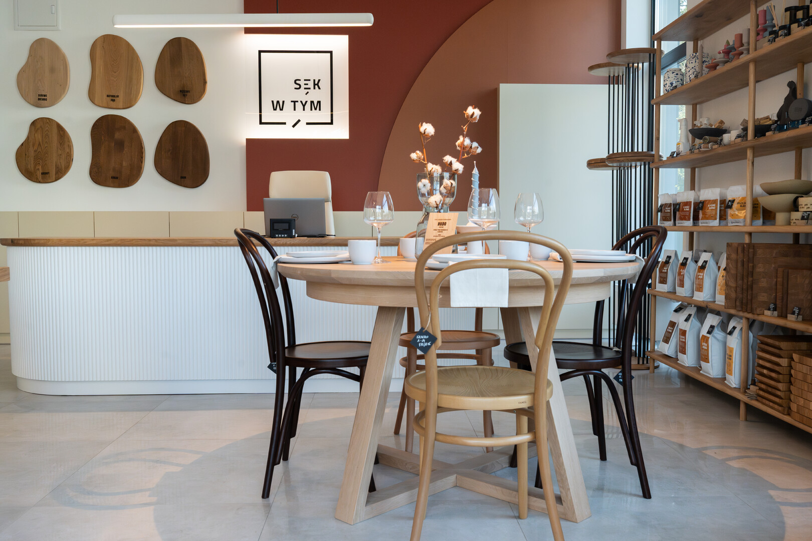 Showroom marki SĘK W TYM w Piotrkowie Trybunalskim. Oprócz naszych dębowych stołów znajdziesz tutaj również krzesła firmy FAMEG jak i dodatki do wnętrz.