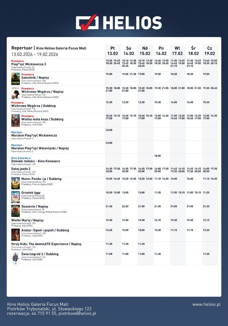 Nowy repertuar kina Helios w Piotrkowie Trybunalskim to wyraźny miks emocji i gatunków. Na ekranach pojawiają się głośne premiery – od bezkompromisowego „Piep*zyć Mickiewicza”, przez widowiskowe kino akcji z Jasonem Stathamem, po monumentalną, mroczną historię miłosną „Wichrowych Wzgórz”. Nie zabraknie też propozycji familijnych, nocnych maratonów filmowych oraz Kina Konesera dla widzów szukających bardziej refleksyjnych historii.