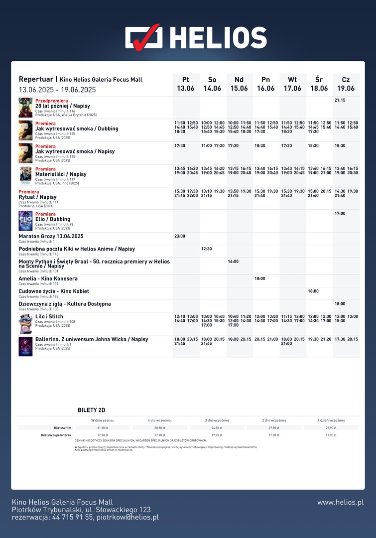 W kinie Helios lato zaczyna się od wielkich emocji na wielkim ekranie! W najbliższych dniach widzowie mogą liczyć na prawdziwe filmowe hity – już w przedpremierze zobaczymy wyczekiwane „28 lat później”, kontynuację kultowej serii o świecie opanowanym przez grozę i chaos. W premierowym repertuarze pojawią się także filmy, które zadowolą zarówno miłośników animacji, jak i ambitnego kina: magiczna opowieść „Jak wytresować smoka”, intrygujący dramat „Materialiści”, mroczny „Rytuał” oraz poruszający „Elio”. To doskonały moment, by zaplanować seans - a może i kilka, bo Helios przygotował także inne propozycje, które warto zobaczyć!