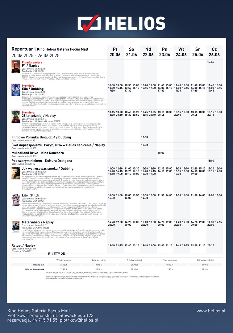 W najbliższych dniach w kinach sieci Helios widzowie mogą zobaczyć kilka gorących premier i przedpremier. Na ekranach debiutuje długo wyczekiwany horror „28 lat później”, kontynuacja kultowej serii, a także familijna animacja od Disneya i Pixara – „Elio”, opowiadająca o chłopcu przypadkowo uznanym przez kosmitów za ambasadora Ziemi. Dodatkowo już 26 czerwca ruszają przedpremierowe seanse filmu „F1” z Bradem Pittem w roli byłego kierowcy Formuły 1, który wraca na tor. Oprócz nowości w repertuarze Heliosa wciąż można zobaczyć m.in. dramat „Rytuał”, komedię romantyczną „Materialiści” czy animacje „Jak wytresować smoka” i „Lilo i Stitch”.