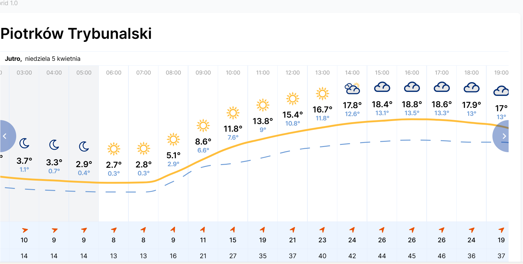 W niedzielę na południowym wschodzie i południu zachmurzenie małe. Na pozostałym obszarze zachmurzenie umiarkowane, od zachodu okresami wzrastające do dużego. Miejscami na północy i zachodzie, a po południu też w centrum, przelotne opady deszczu. W centrum lokalnie możliwe burze, w ich trakcie prognozowana suma opadów do około 10 mm. Temperatura maksymalna od 12 st. C nad morzem i 14 st. C miejscami na północy do 18 st. C, 19 st. C w centrum i 20 st. C, 21 st. C na południowym zachodzie i południu. Wiatr umiarkowany, okresami dość silny i porywisty, na obszarach podgórskich w Karpatach w porywach do 60 km/h, na północy i zachodzie w porywach do 65 km/h, południowo-zachodni. Nad morzem wiatr dość silny i silny, do 45 km/h, w porywach do 80 km/h, południowo-zachodni. W czasie burz porywy wiatru do 65 km/h. Wysoko w Karpatach porywy wiatru do 75 km/h, na szczytach Sudetów do 90 km/h. Wysoko w Karpatach wiatr powodował będzie zamiecie śnieżne.